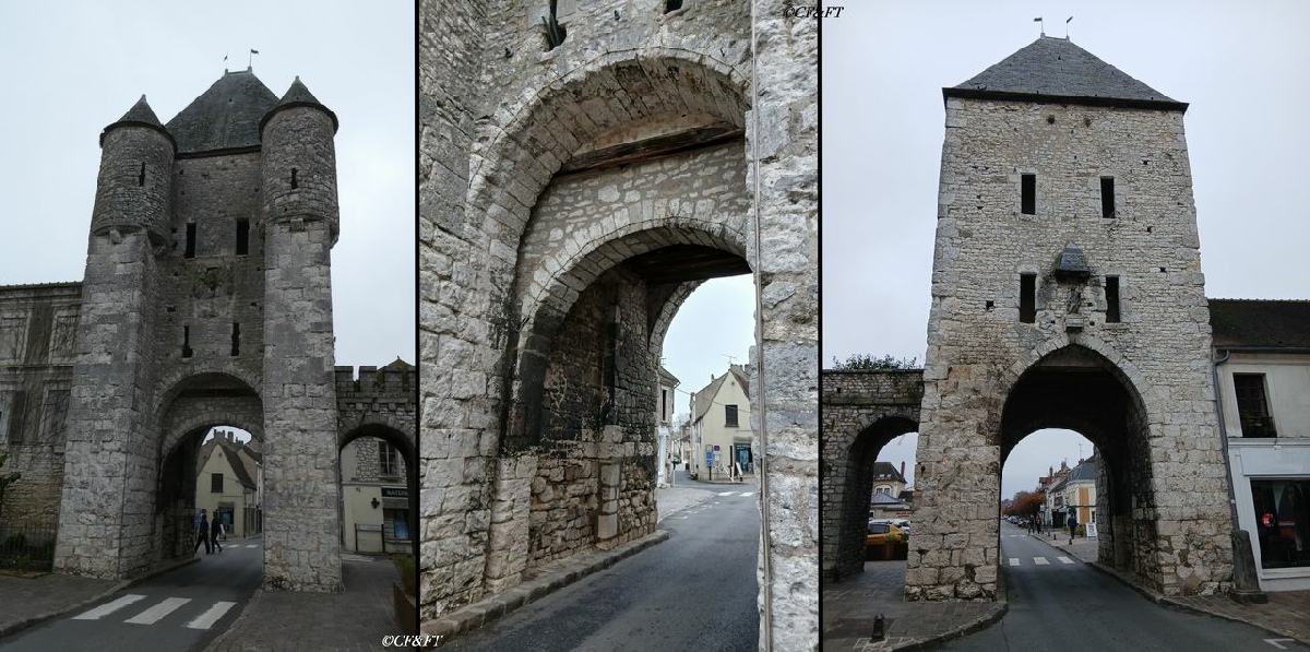 Celle-ci se développait sur environ 1.400 m et était flanquée, tous les 50 m environ, de tours semi-circulaires (sauf celles d’angle - circulaire). Au nombre de douze aujourd’hui, elles sont quasiment toutes arasées au niveau des courtines. Trois tours-portes (et une poterne) perçaient la muraille. La tour de Bourgogne (à l’autre bout du pont) est une tour carrée aux murs épais formant contreforts. Deux escaliers droits amènent aux étages dont le 1er servait à manœuvrer la herse. Son sommet conserve quatre échauguettes d’angle et une terrasse « cachée » par la pose d’un toit au XVIIème s. La porte de France (D. Hayot) ou de Sammois (Ch. Corvisier) se dresse à l’autre bout de la Grande-Rue. On peut noter, par rapport à la première, l’absence d’escaliers droits dans les massifs latéraux et d’échauguettes vers la ville. Une troisième tour-porte (porte d’Orléans) a été détruite en 1820.