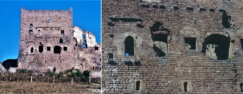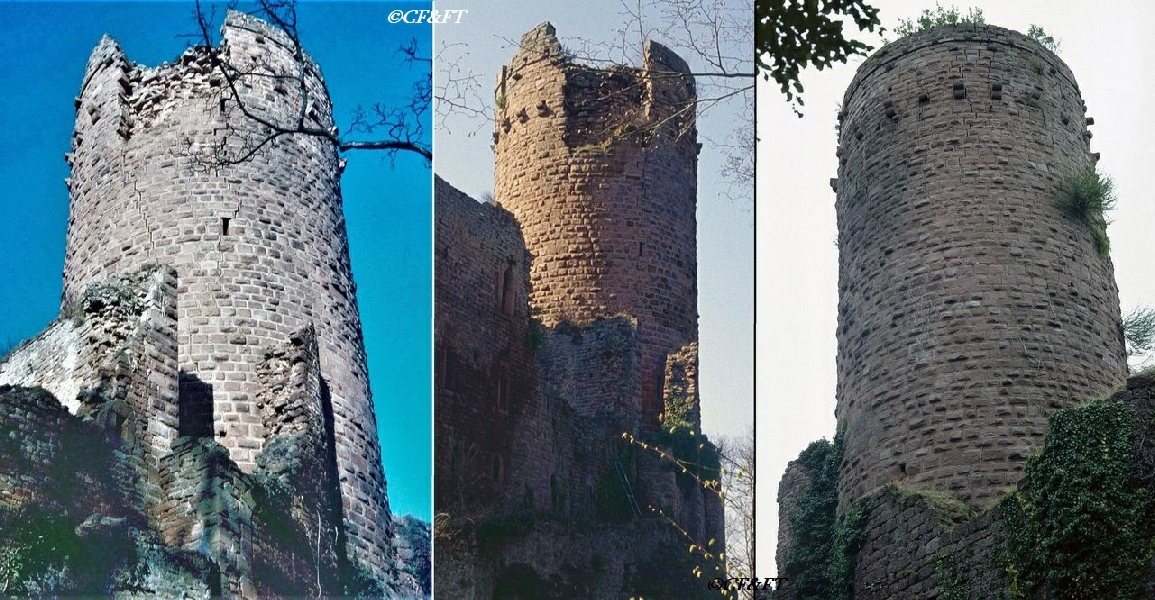 Les Hohenstaufen, sur la partie ouest du site, construisent au début du XIIIème s. la tour d’habitation [4] ou donjon-palais [1] (vers 1180-1200 [2], fin XIIème s. [5], vers 1200 [4], peu après 1220 [3]). Charles-Laurent Salch en précise la chronologie : 1200-1208, les deux premiers niveaux sont construits ; 1214/1215, reprise des travaux ; 1218/1220 : construction des deux derniers niveaux. Le logis, adossé au donjon-palais, contemporain de la tour [5] est surélevé dans la première moitié du siècle [2] (entre 1250 et 1300 [5]). Le donjon circulaire (ou bergfried), de 25 m de haut [5], est construit vers 1250 (entre 1225 et 1250 [5]) ; la tour en forme de fer à cheval, flanquant l’enceinte à son angle nord-ouest, après 1250 [1]. Ce nouveau château est tenu en fief * par les Lutzelbourg [2]. A l’extinction de cette lignée -au milieu du XIIIème s.-, les Rathsamhausen le récupèrent. Ils le vendront en 1424, pour le racheter en 1553. Durant cette période, les Mullenheim restructurent la place -voir le style Renaissance des bâtiments- [3] (à partir de 1521 [2], entre 1523 et 1530 [3]). Des fausses-braies et une barbacane sont édifiées au XVème s. [2]. Jean-Marie Nick date cette dernière du milieu du XIVème s. Le château est occupé jusqu’au XVIIIème s. et a comme fonction, l’élevage de chevaux. Dix-huit squelettes d’équidés ont été retrouvés lors de fouilles archéologiques [2] commencées en 1967 [4]. Dans les années 1980, des travaux de consolidation sont lancés mais un dramatique accident va tout stopper [4].