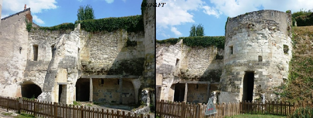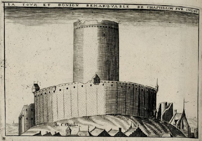 Une donation du IXème s., relatée trois siècles plus tard, mentionne la motte et la « demeure » de Châtillon (Jean-Pascal Foucher *). C’est sous le comte d’Anjou -Henri II Plantagenêt-, qu’un shell-keep ou donjon annulaire prend place au sommet de la motte (dans la décennie 1150). La construction d’une tour circulaire, en son centre, aurait suivi une trentaine d’années plus tard. Une analyse dendrochronologique** nous donne l’année 1188 comme date terminale. Une partie de la chemise à pans (du côté de la basse-cour) aurait été supprimée à cette occasion puis reconstruite, en y intégrant une tourelle d’escalier, dans le second quart ou le milieu du XVème s. A cette époque, on aménage également la salle du 1er étage du donjon -cheminée et portes- (Christian Corvisier ***).