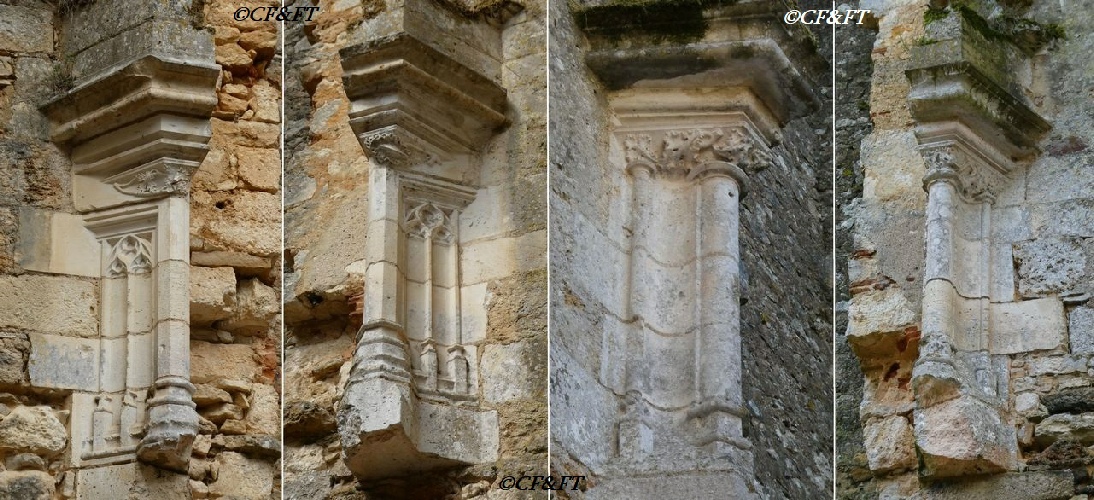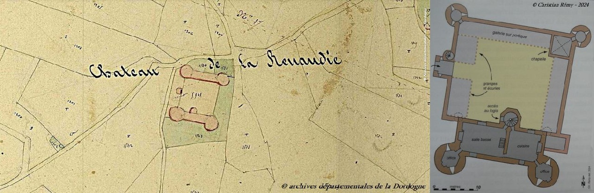 De nos auteurs, seul Charles-Laurent Salch nous dit : manoir ruiné du XVème s., avec enceinte rectangulaire (27 m x 23 m) flanquée de tours rondes. La documentation locale nous donne un peu plus de détails. Vers 1320, Olivier Maurin fait bâtir le repaire de l’Arnaudie. Le manoir « ruiné » pourrait en avoir pris la forme (logis à refend -20 m x 8,50 m- flanqué de tours d’angle avec une tour quadrangulaire supplémentaire près de l’angle nord-est). En 1454, le repaire passe, par mariage, aux mains des du Barry. Six ans, plus tard, le repaire et hostel noble est élevé au rang de château et de maison forte. Faut-il y voir la construction de l’enceinte à tours et tour-porche à pont-levis ? Christian Rémy * grâce aux détails stylistiques du logis et des ouvertures de tir, date l’ensemble de la toute fin du XVème s. ou du tout début du XVIème. A porter au crédit des du Barry qui garderont la place jusqu’en 1598. Au siècle suivant (en 1609 pour la doc. locale et 1614 pour Ch. Rémy), la Renaudie entre en possession des Pérusse des Cars. La documentation locale voit en ces derniers les constructeurs de ce que nous voyons aujourd’hui. En 1774, un inventaire indique que le château est en bon état. Vingt ans plus tard, les toitures menacent ruine. La Révolution le transformera en carrière de pierre. Toutefois, en 1855, les planchers sont toujours présents ainsi que les deux fenêtres à croisée du 1er étage. Les bases de la tour d’escalier hexagonale sont encore visibles. Il est à noter qu’un inventaire, daté de 1686, nous renseigne sur les fonctions des pièces : cuisines, offices, salle haute, chambre rouge, de Pompadour, de Monsieur, le tout avec antichambre, greniers, galerie menant à la chapelle, grange et écuries (Ch. Rémy).