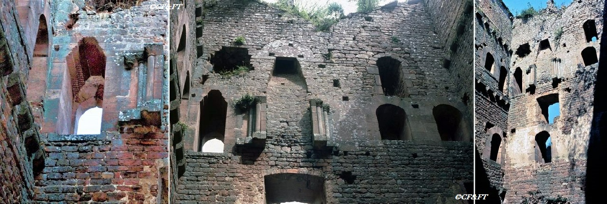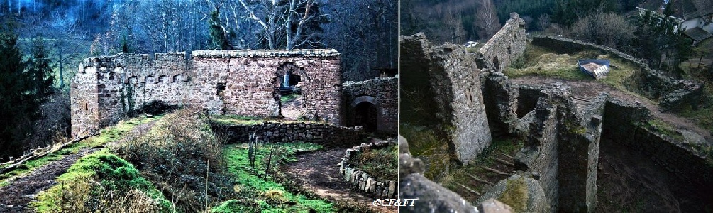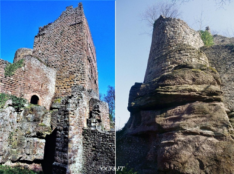 Les Hohenstaufen, sur la partie ouest du site, construisent au début du XIIIème s. la tour d’habitation [4] ou donjon-palais [1] (vers 1180-1200 [2], fin XIIème s. [5], vers 1200 [4], peu après 1220 [3]). Charles-Laurent Salch en précise la chronologie : 1200-1208, les deux premiers niveaux sont construits ; 1214/1215, reprise des travaux ; 1218/1220 : construction des deux derniers niveaux. Le logis, adossé au donjon-palais, contemporain de la tour [5] est surélevé dans la première moitié du siècle [2] (entre 1250 et 1300 [5]). Le donjon circulaire (ou bergfried), de 25 m de haut [5], est construit vers 1250 (entre 1225 et 1250 [5]) ; la tour en forme de fer à cheval, flanquant l’enceinte à son angle nord-ouest, après 1250 [1]. Ce nouveau château est tenu en fief * par les Lutzelbourg [2]. A l’extinction de cette lignée -au milieu du XIIIème s.-, les Rathsamhausen le récupèrent. Ils le vendront en 1424, pour le racheter en 1553. Durant cette période, les Mullenheim restructurent la place -voir le style Renaissance des bâtiments- [3] (à partir de 1521 [2], entre 1523 et 1530 [3]). Des fausses-braies et une barbacane sont édifiées au XVème s. [2]. Jean-Marie Nick date cette dernière du milieu du XIVème s. Le château est occupé jusqu’au XVIIIème s. et a comme fonction, l’élevage de chevaux. Dix-huit squelettes d’équidés ont été retrouvés lors de fouilles archéologiques [2] commencées en 1967 [4]. Dans les années 1980, des travaux de consolidation sont lancés mais un dramatique accident va tout stopper [4].