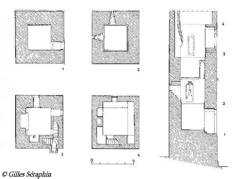 La tour se compose d'un niveau d'accès (sur base pleine), un premier étage (avec deux fentes de jour), une chambre d'habitation (avec cheminée, armoire murale et latrines en encorbellement) et un étage sommitale sur lequel repose la toiture. Pour accéder au sommet, un escalier mural part de la pièce d'habitation.