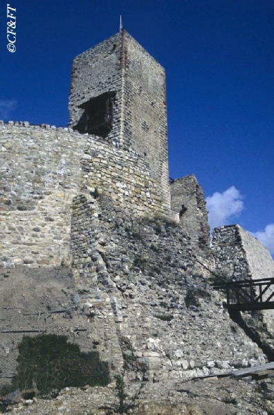 L'enceinte, en forme de fer à cheval, qui protégeait le donjon et le logis est conservée dans sa quasi totalité. Une tour-porte, sur sa face Est, accueillait l'entrée de cette cour noble. Elle porte à sa base un rebord étroit (mini talus) qui permettait de faire rebondir les pierres lancées du sommet. Le donjon carré (7 m de côté), bâti face à l'attaque, était habitable (latrines et restes d'un poêle, daté de la fin du XIIème/début du XIIIème s.). Un mur bouclier et un fossé de 18 m de large protégeaient le donjon au nord. Sur celui-ci, face sud, l'association a reposé le balcon/hourd.