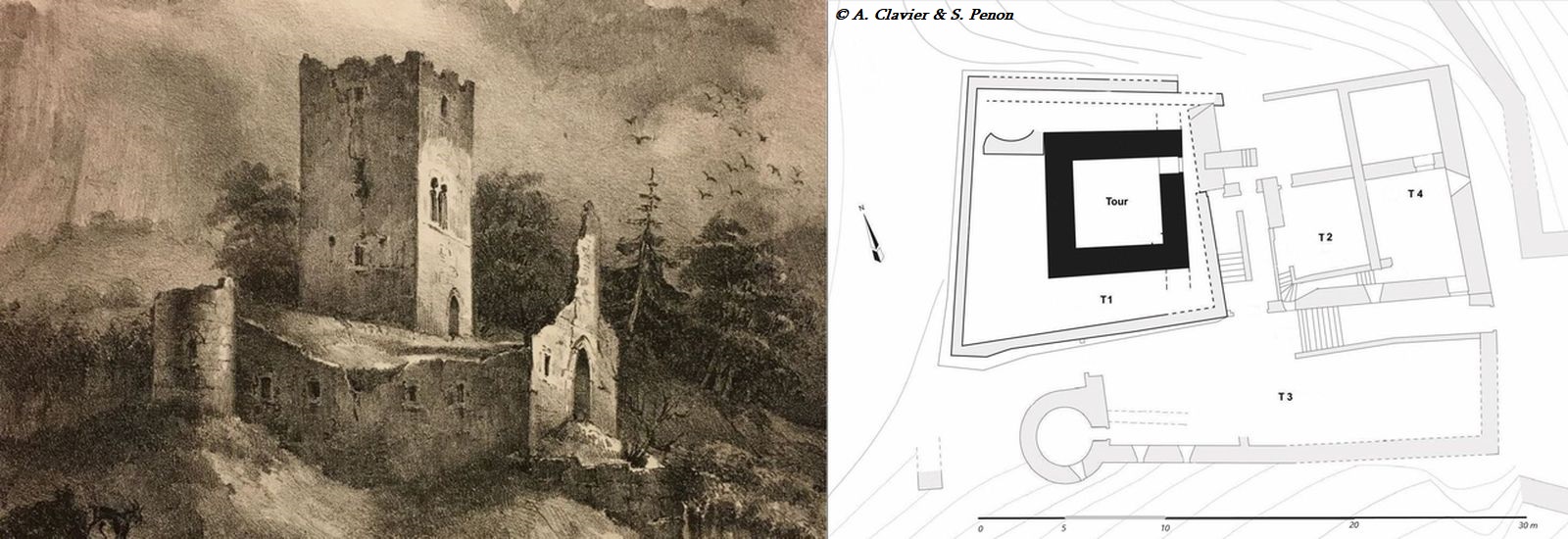 Le site se développe sur cinq terrasses échelonnées sur une crête rocheuse. La tour carrée (8 m de côté – 13,50 m de hauteur actuelle – avec cheminée et baie géminée), traditionnellement datée du XIIème s., prend place sur la plus haute terrasse et la « maison » sur deux autres, à l’est de la première. Annick Clavier et Séverine Penon * datent cette « maison » du XIIIème s. Deux siècles plus tard, celle-ci est agrandie par un long bâtiment (22 m x 5 m environ) qui prend place au sud des trois terrasses. Son côté ouest est flanqué par une tourelle circulaire qui défendait l’entrée du site. A. Clavier et S. Penon, grâce à la découverte de tessons de céramiques, datent de la même période, la chemise défendant la base de la tour. Pourquoi avoir attendu trois siècles pour mieux la protéger ? A notre avis, une chemise contemporaine de la tour n’est pas à exclure (même si des artefacts du XIIème s. n’ont pas été retrouvés).