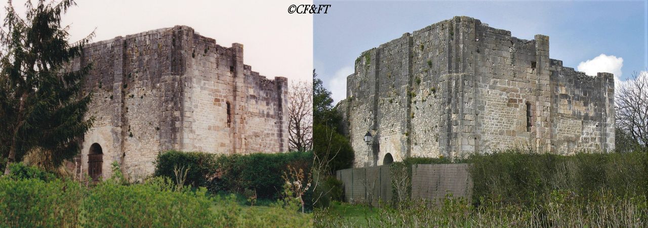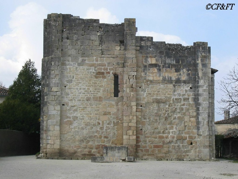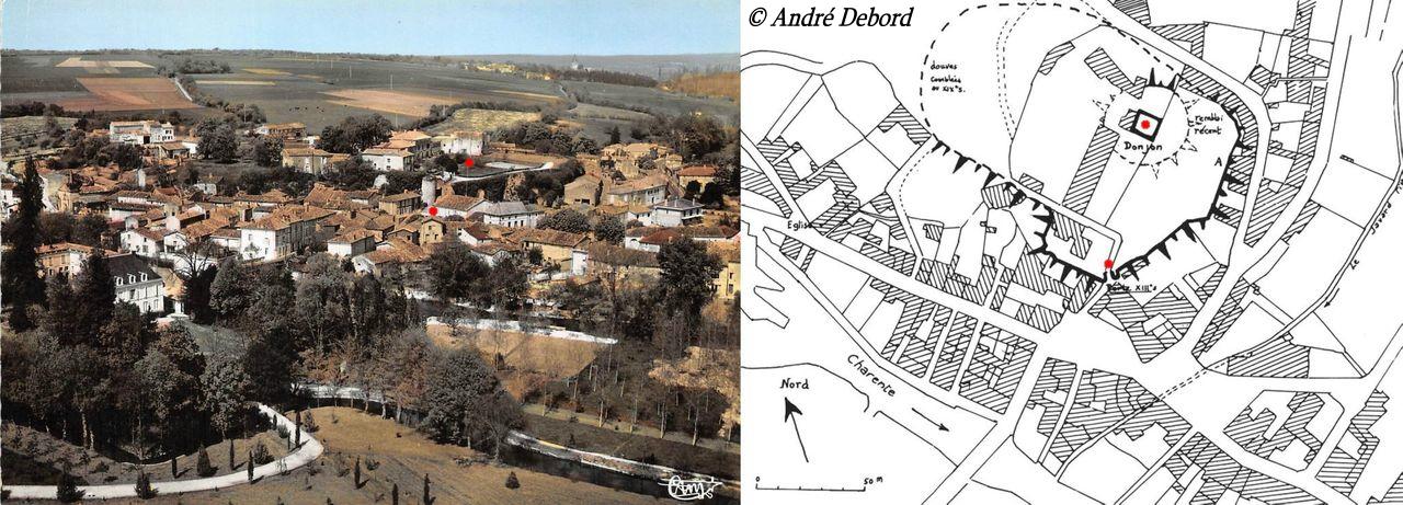 Si André Châtelain et Charles-Laurent Salch datent l'enceinte, encore présente face sud, du XIIIème s., Jean Mesqui date les deux tours pleines de la porte d'entrée (à herse ou assommoir), de la fin du XIIème s. Il y voit le style Plantagenêt.