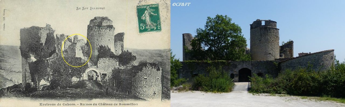 C’est Folc de Roussillon, seigneur des lieux vers 1300, qui donne son nom au château que nous connaissons aujourd’hui. Les familles d’Antéjac et de Vayrols s’y succéderont dans ce même siècle. En 1430, le mariage de Marguerite de Vayrols avec Guillaume d’Auriole fait passer Roussillon entre les mains de cette famille. L’évêque de Mautauban, Jean d’Auriole, et son frère Aymar font réédifier la place forte à partir de 1491. Du XVIème s. (1517) au XVIIIème, le château est possession de la famille périgourdine des Gontaud-Cabrerets qui, trop loin, le délaisse. Au début du siècle suivant, le château commence à être démantelé. Il sera restauré à partir de 1958.