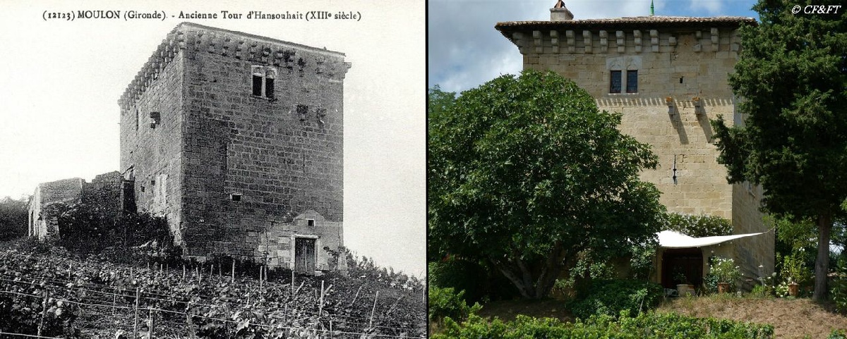 Charles-Laurent Salch, dans son atlas géographique, répertorie un donjon-manoir (la tour d’Ansouhaite) et trois mottes féodales à Moulon. François Léo Drouyn *, en 1862, appelle cette maison forte « la motte ». Sa construction est autorisée, le 29 mai 1314, par le roi d’Angleterre Edouard II ; son seigneur, Raymond de Grésignac, pouvant fortifier sa « terre » de Moulon. Vers 1430, Henri IV donne celle-ci à son fils, Humphrey de Lancastre, duc de Gloucester. A la Révolution, la tour appartient à un ordre religieux bordelais. A partie de 1981, ses propriétaires se lancent dans sa restauration.