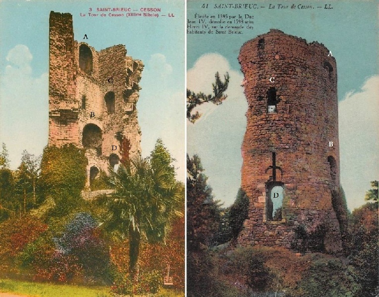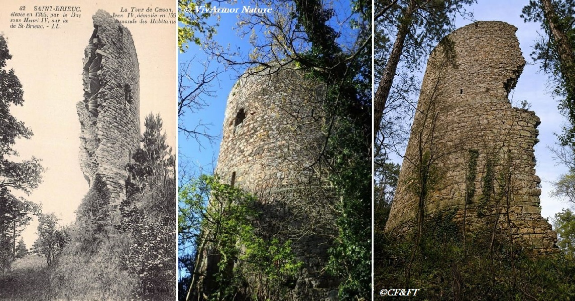 « Le château très fort et très redoutable car la mer le borde étroitement, sauf d’un côté » est la première mention -de la fin du XIIème s.- du castrum de Cesson. Bien « qu’imposante » la place est prise, par le comte Alain Ier de Penthièvre, après août 1186. En 1392, Olivier de Clisson cède celle-ci -sans doute démantelée- à Jean IV, duc de Bretagne. C’est ce dernier qui fait bâtir, de 1395 à 1407 (base Mérimée), la tour circulaire aux salles hexagonales. Toutefois, une mention datant de janvier 1400 évoque déjà la « tour et forteresse de Cesson ». Durant la huitième guerre de Religion (en 1592), le duc de Mercœur, fervent catholique, s’empare de la tour et la fortifie (constructions de deux bastions au sud-ouest et nord-est de celle-ci). Fortification efficace car elle résiste à un siège six ans plus tard. Il faudra une demande expresse des habitants de Saint-Brieuc pour qu’au mois de novembre de cette même année, la tour soit minée et détruite en grande partie.