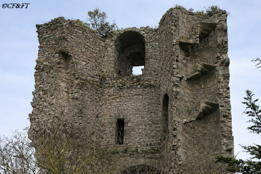La tour, coupée en deux, nous permet de découvrir un escalier en vis, des baies à coussiège et une cheminée. A l’extérieur, une porte à pont-levis présente un dispositif original. En effet, sa rainure verticale (où s’insère la flèche du pont) se croise en son milieu avec une seconde rainure en demi-cercle, moins profonde. Pour Prosper Mérimée, « son usage est très difficile à deviner ».